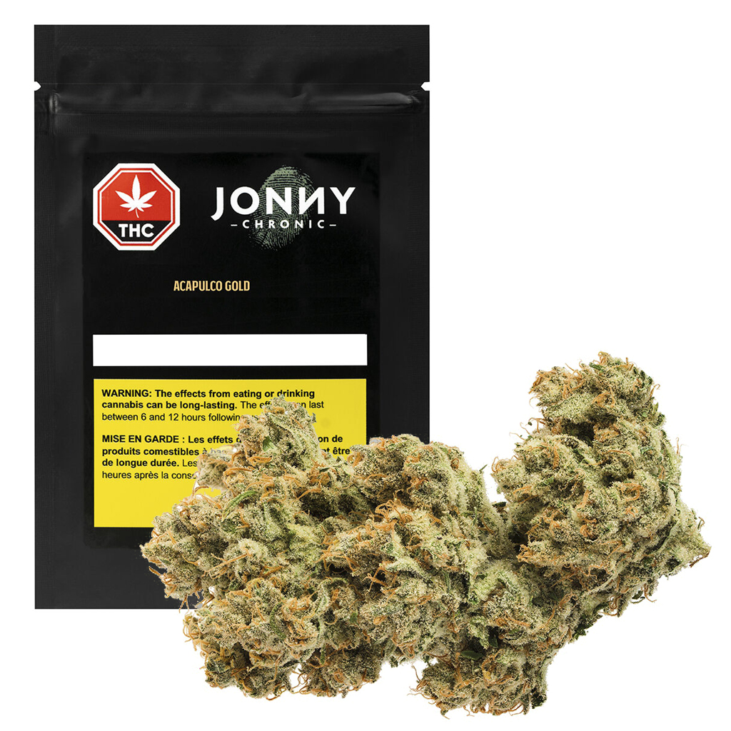 Acapulco Gold from Jonny Chronic is a potent sativa strain that produces big beautiful buds that glisten with trichome-covered leaves and copper orange pistils. Acapulco Golds is a landrace that originates from Central America and is dominant in terpinene, caryophyllene and myrcene. Acapulco Gold plants are grown with care in small batches before they are hang dried, slow cured and delicately hand trimmed and then packaged fresh to preserve their true elegance.