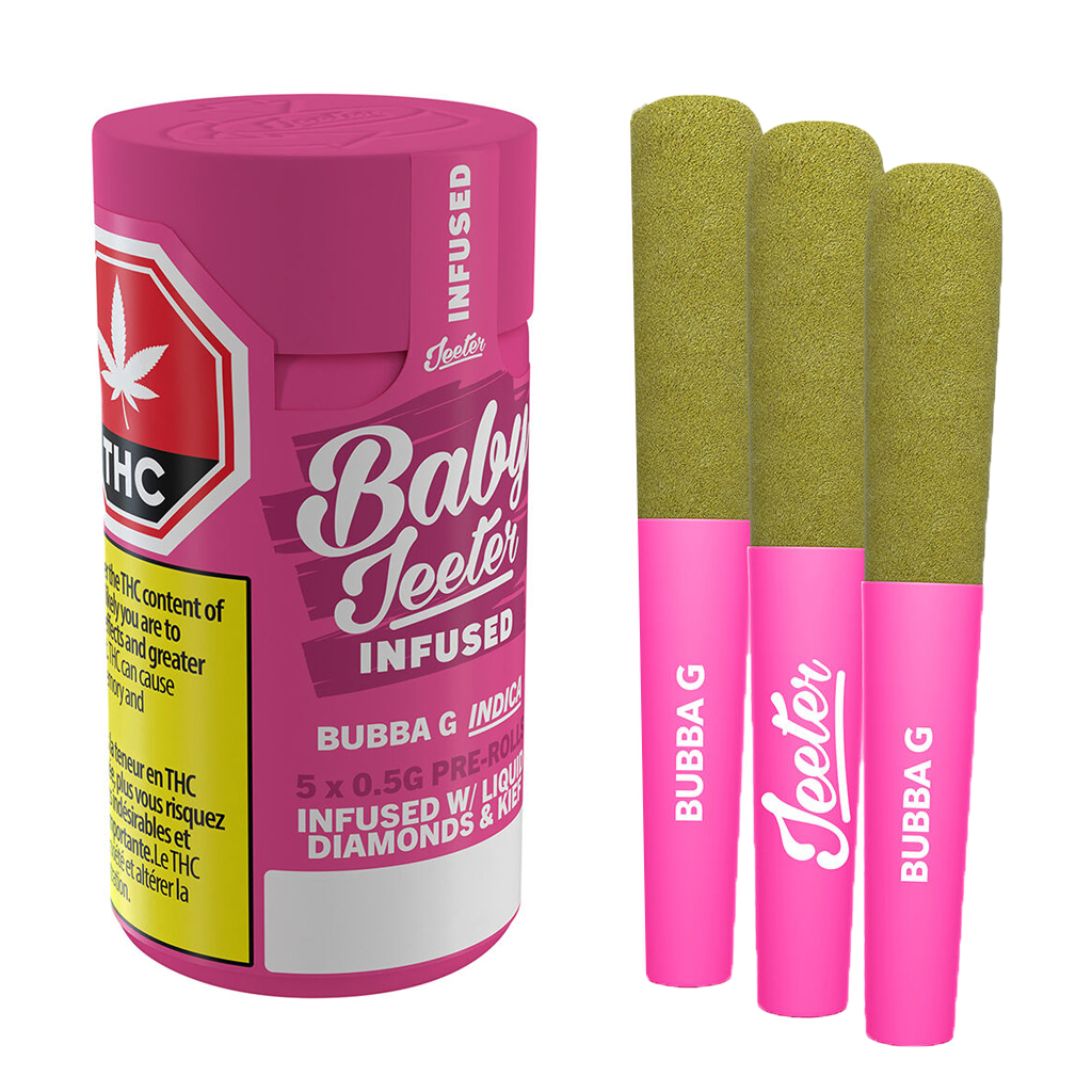 Get ready, Canada! Jeeter is making its grand debut in the Great White North. Baby Jeeters promise an experience that's anything but small. Every meticulously crafted pre-roll is infused with diamonds, crowned with a layer of kief and charged with a burst of unparalleled flavour. Embrace the best, Canada. Jeeter has landed. Bubba Gum stands out among indicas due to its mysterious origins. Rumours point to a unique cross involving Indiana Bubble Gum. Each puff of our Bubba G pre-rolls is a sweet berry experience, giving way to a light spiciness on the exhale. Heavy berry overtones are immediately apparent in the aroma, lingering with earthy Kush and flowery herb notes.