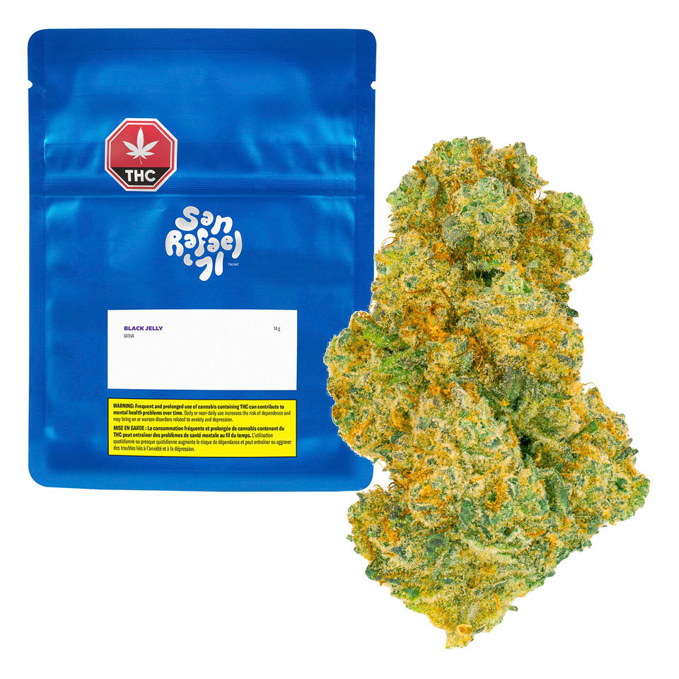 Black Jelly by San Rafael ’71 is a premium, indoor-grown strain developed from Alien Cake 3030 genetics. What makes this sativa so special is its one-of-a-kind aroma of liquorice and anise with hidden notes of sweet fruit. Its dense buds come impressive in size and shape with eye-catching green and orange hues, topped with a coat of sparkling trichomes. Cultivated under the highest quality standards, San Rafael '71 flower is hang-dried, hand-finished, and carefully hand-bottled with an included humidity pack.