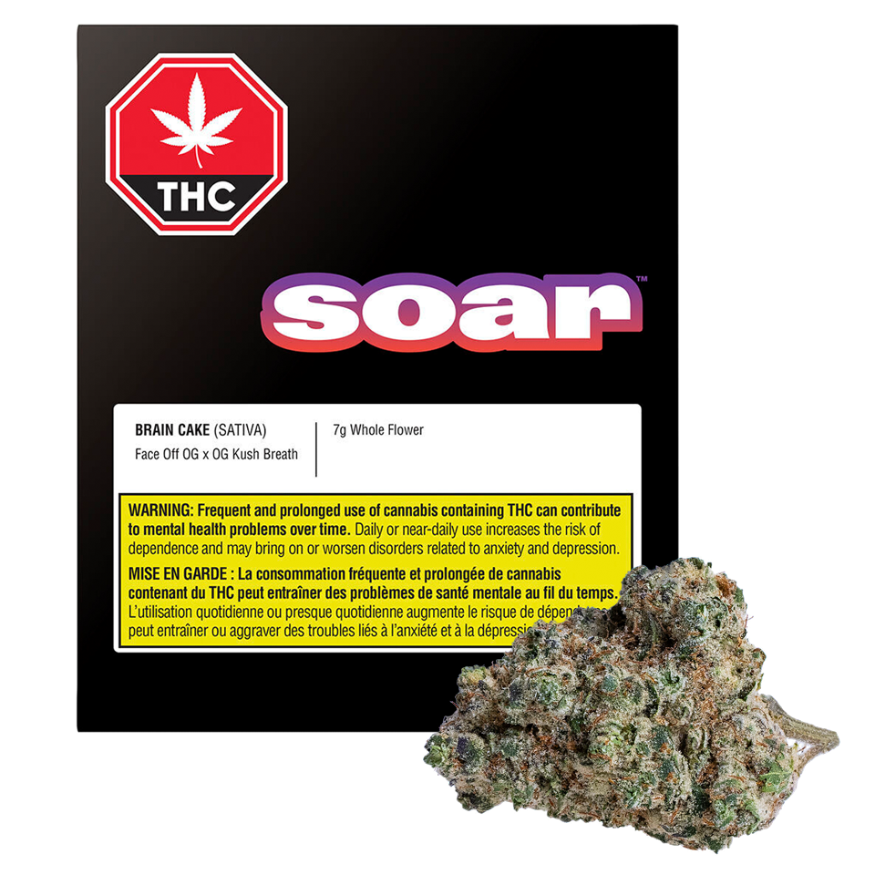 Brain Cake is a sweet and cakey, smooth-smoking sativa cultivar with large, frosty buds. A cross of Face Off OG x OG Kush Breath, it delivers mouthwatering aromas of creamy cake, ripe berries, and a touch of floral citrus on the finish from dominant terpenes myrcene, limonene, and caryophyllene. Soar is selective and disciplined in process. Grown in smaller batches and carefully sorted to ensure only our best buds make it through. Hand-harvested, hang-dried and hand-detailed with a humidity pack in every bag.