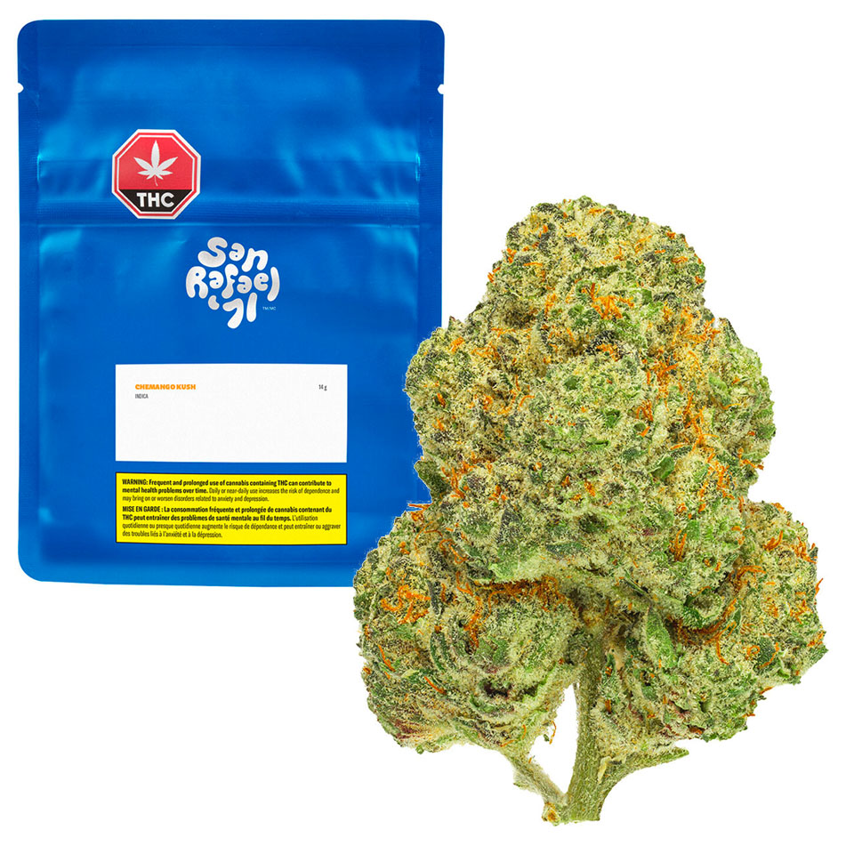 Chemango Kush by San Rafael ’71 is a premium, indoor-grown strain bred from premier genetics from a world-class breeding facility in Comox, British Columbia. A next-generation cultivar, Chemango Kush was bred to deliver high THC potency and an intriguing blend of fruit, sour, and chem aroma notes. This powerful indica features huge, ultra-dense buds with gorgeous olive-green tones and glistening trichomes. Chemango Kush is hang-dried, hand-finished, and carefully hand-bottled with an included humidity pack.