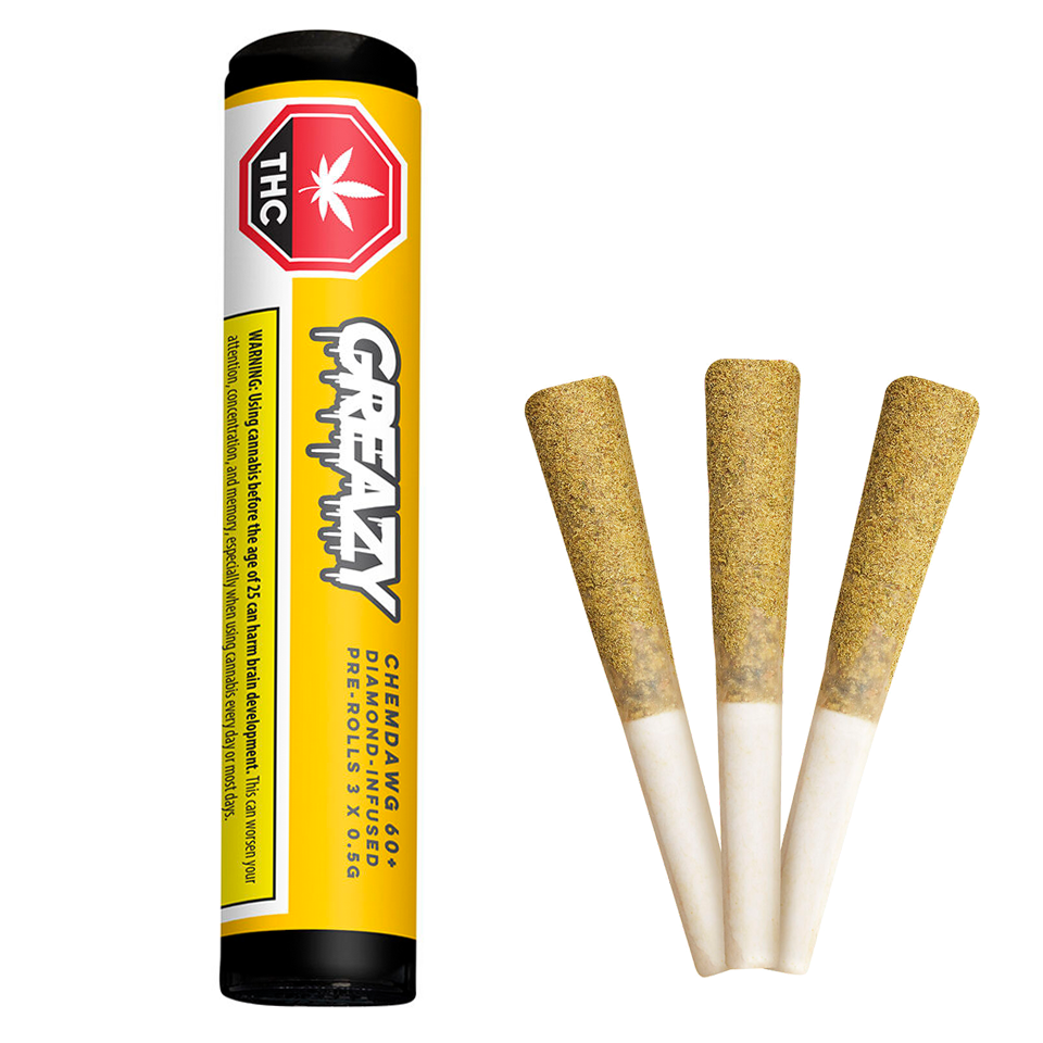 Chemdawg 60+ is a double-infused pre-roll featuring a bold, diesel-forward aroma with subtle citrus undertones. Made with high-quality flower and diamond concentrate, this pre-roll offers a distinctive flavour profile.