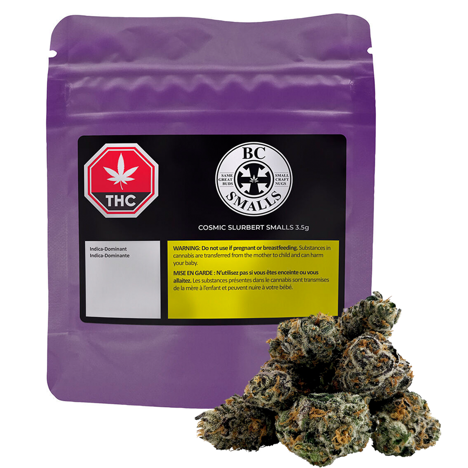 Cosmic Slurbert is a cross of Cosmic 22 and Slurbert bred by a legacy breeder in the Okanagan Valley of BC. With an exciting extended lineage of (Slurricane x Sherbert) x (Bakers Dozen x Falcon 9) this is a potent indica.