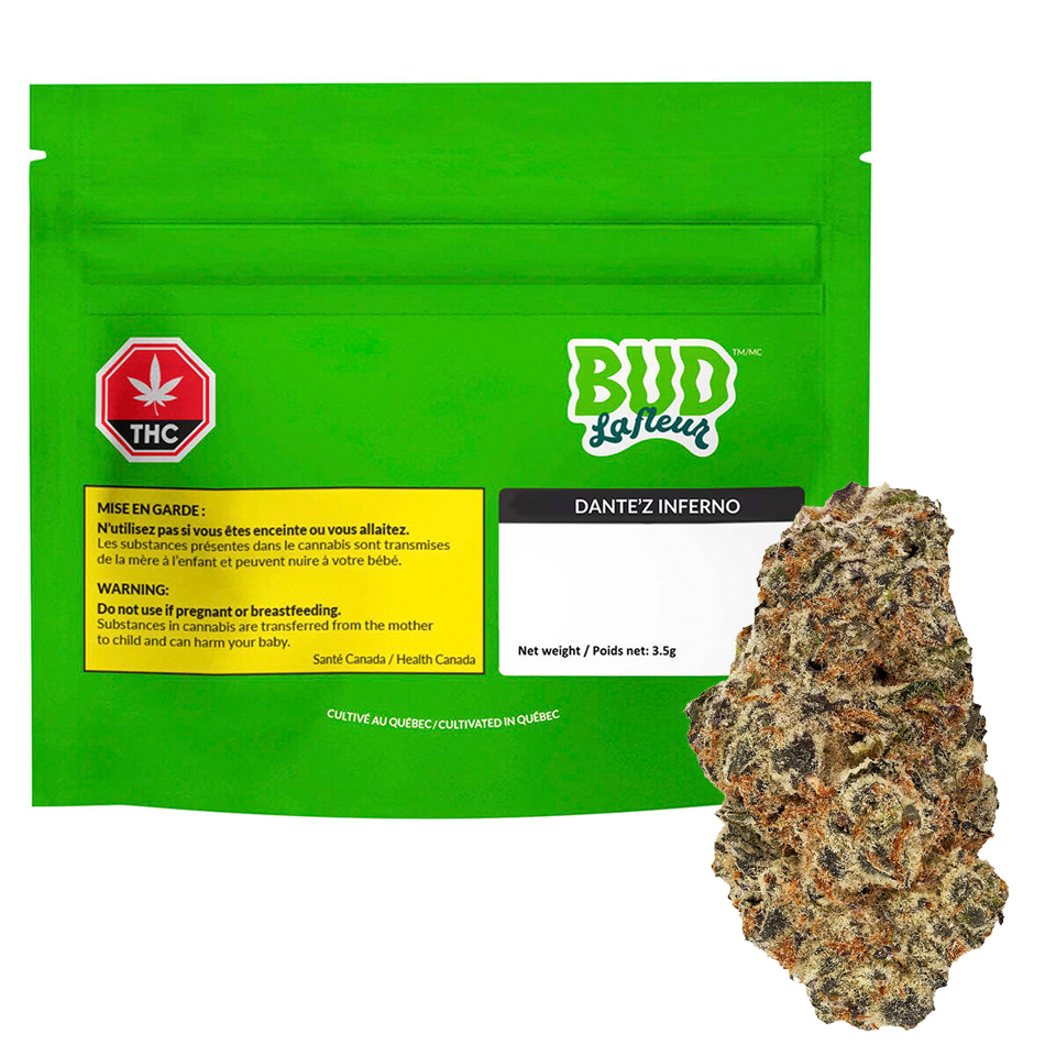 Dante’z Inferno is an indica strain high in THC. Born from the legendary cross of Oreoz and Devil Driver, this strain delivers dense, cone shaped buds in a wicked green with purple streaks. The flavour offers sharp diesel with smooth creaminess and a bold fruity finish. Dominated by limonene, caryophyllene and myrcene. Cultivated indoors in Pointe-Claire, Quebec, Dante’z Inferno isn’t just grown, it’s crafted. Hand harvested, whole plant hang dried, hand trimmed and cold cured for 14 days, every bud is treated like royalty. We hand pack each package too, because this strain deserves nothing less.