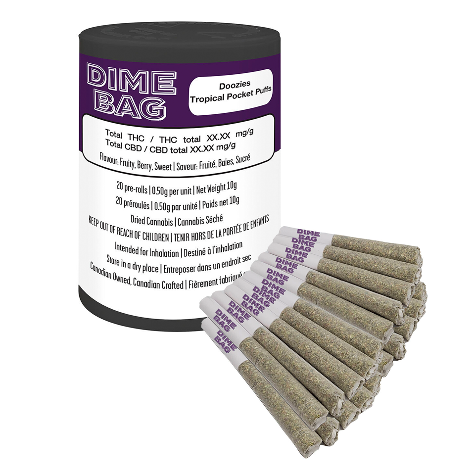 Dime Bag Doozies Tropical Pocket Puffs pre-rolls offer more flavour, more potency and more value. Bursting with sweet berry and tropical fruit notes, this sativa blend is made with whole flower and packed for a smooth and consistent burn. Big on flavour and value.