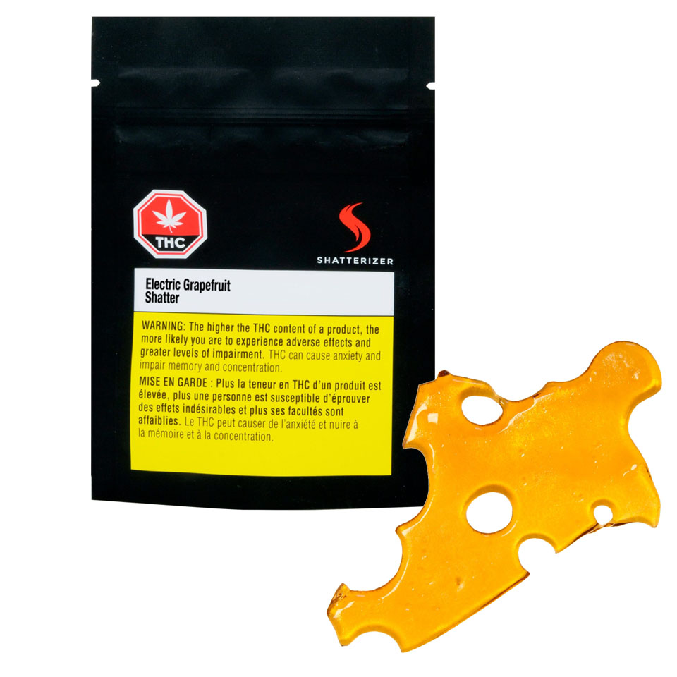 Our Electric Grapefruit Shatter is a vibrant and solid concentrate that stands out in every way. Derived from sativa strains, Electric Grapefruit is rich in trichomes. The terpenes in Electric Grapefruit burst with citrus and zesty limonene, complemented by the earthy myrcene and spicy caryophyllene. Only fresh cannabis inputs are used with a proprietary blend of hydrocarbons in all extraction processes. We source and select flower from growers across Canada, focusing on optimal THC levels, terpenes and flavonoids. All Shatterizer extracts are made with precision in Ontario, using cutting edge science, technology and quality extraction methods.