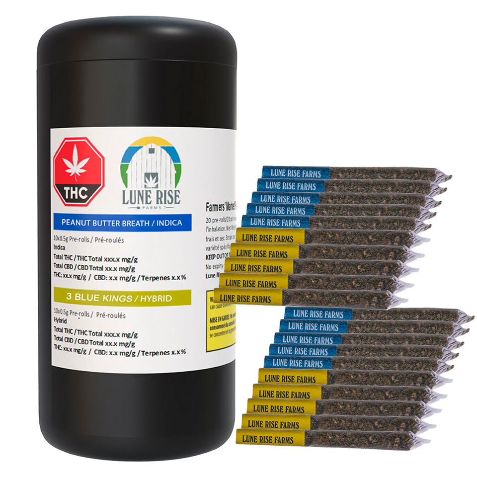 Each rotational Farmers' Market 20 x 0.5g Pre-Roll Variety Pack features a curated selection of two of our seasonal strains. Lune Rise Farms whole flower pre-rolls are single-strain-sourced, hand-harvested, hang-dried and cured to preserve each strains unique cannabinoid and terpene profile. At Lune Rise Farms, we are committed to bringing the time-honoured traditions and practices of regenerative farming to the cultivation of cannabis. We truly believe that natural products are best looked after by the craftspeople of the earth — the farmers. We grow and harvest; we don’t manufacture.