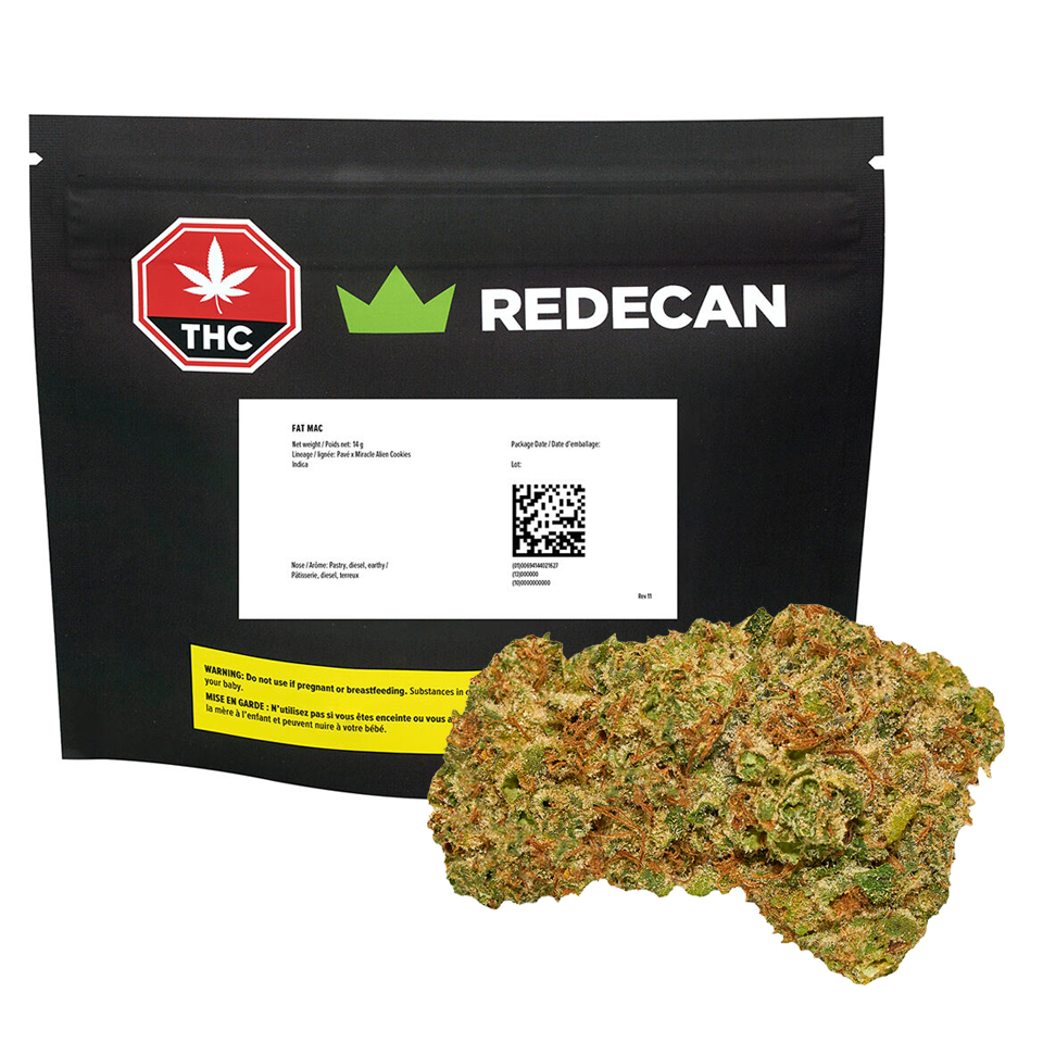 Meet Fat Mac, a potent indica. Bred from Pavé x Miracle Alien Cookies, this new Redecan core strain flexes high THC with pastry, diesel-rich and earthy flavours. These dense and sticky buds are everything you want in an indica with loud aromas, bold flavour and high potency. Meticulously grown in single strain, climate controlled rooms, each bud is carefully hang dried and hand trimmed to deliver a clean burn and a smooth smoke that’s all Redecan. Fat Mac is stacked with flavour and sticky with trichomes.
