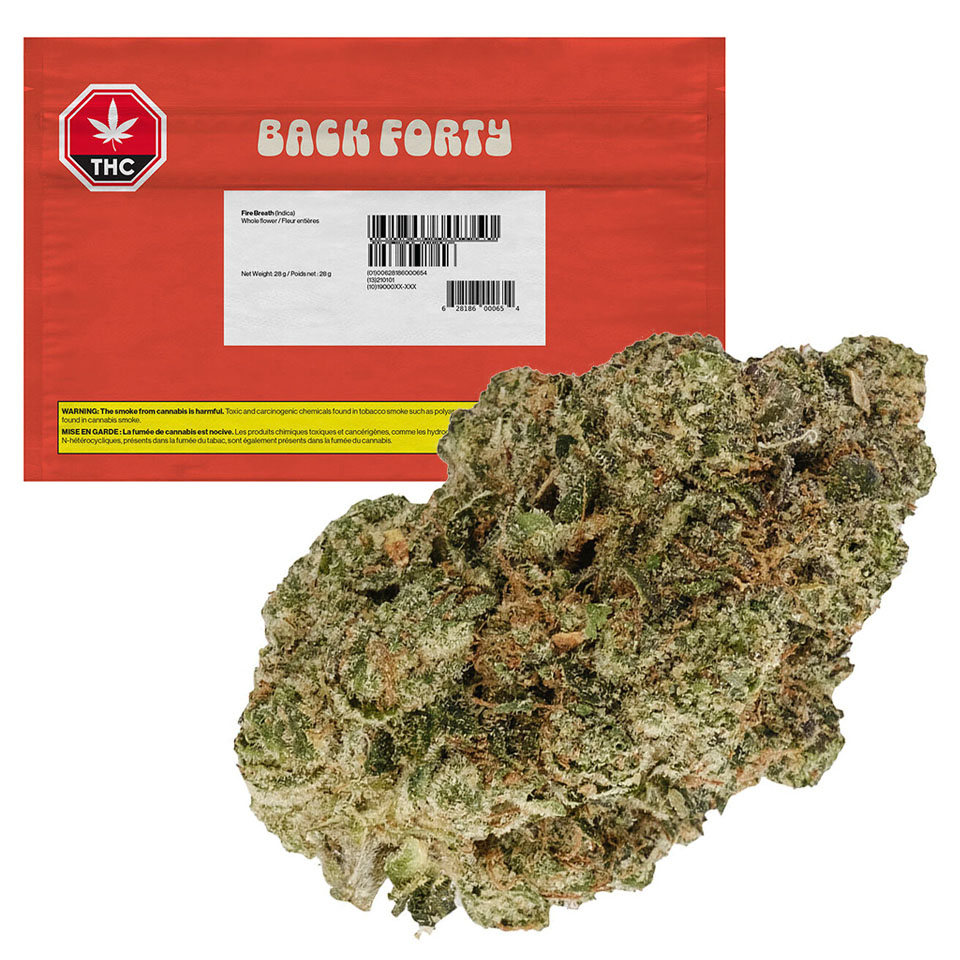 Turn up the heat with Back Forty's legendary cultivar – Fire Breath. A cross between Fire OG x Mendo Breath, this potent indica produces dense buds loaded with trichomes, offering pungent notes of fresh earth, woody spice, and a hint of diesel. Our Back Forty flower is always hang-dried, dry-trimmed, and includes a humidity pack.