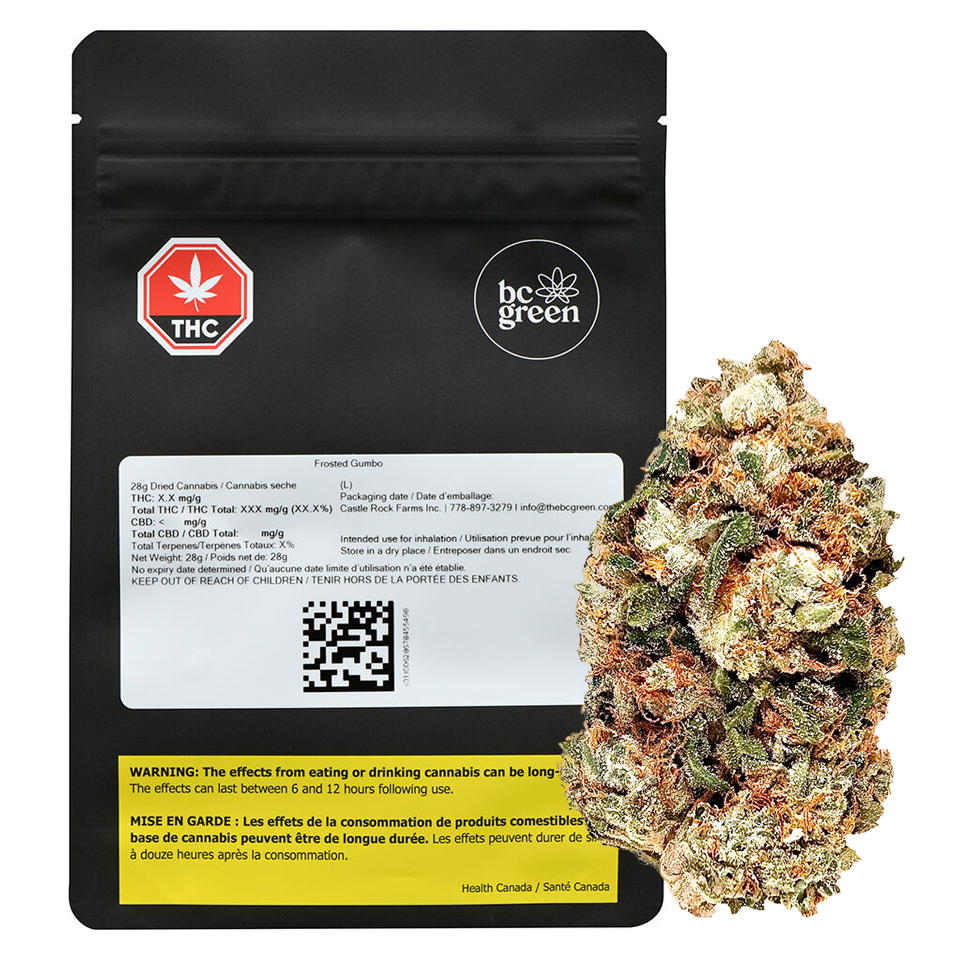 Frosted Gumbo is an indica dominant cultivar with a marvellously gassy and vanilla nose. It's intriguing lineage is Bubblegum x (Secret Strain x Gelato). Having a sweet and intense flavour, Frosted Gumbo blends both sweet and spicy flavours. Top terpenes include caryophyllene, myrcene and limonene.