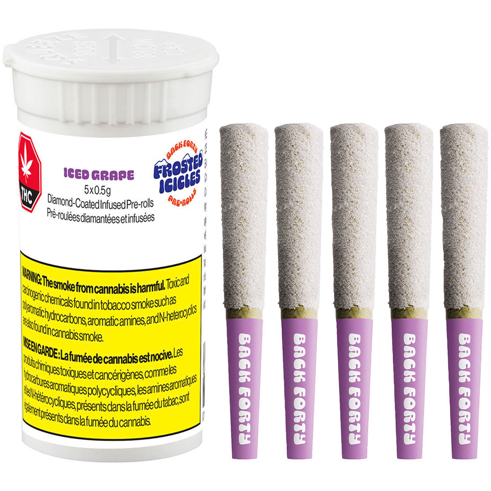 Back Forty's Frosted Icicles are infused pre-rolls coated in a layer of THCa diamonds, the perfect blend of potency, aroma and flavour in expertly rolled cones. Iced Grape is a cool twist on the classic purple with notes of sweet grape and cooling ice.