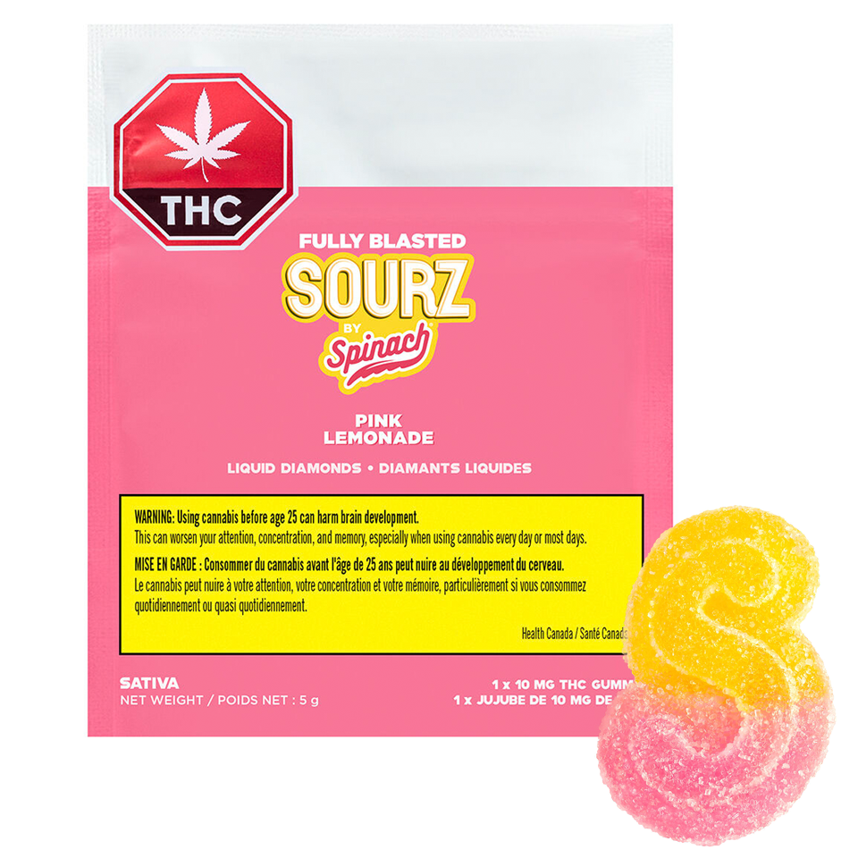 Prepare for blast off! SOURZ by Spinach® Fully Blasted Pink Lemonade gummies are packed with 10mg THC per piece. Send your taste buds into the stratosphere with the sweet and fresh flavours of raspberry and lemonade! These dual-flavoured gummies are over-the-top with natural flavours and blasted with sour crystals. Enjoy 10 gummies with 10mg THC per gummy and 100mg THC per pack.