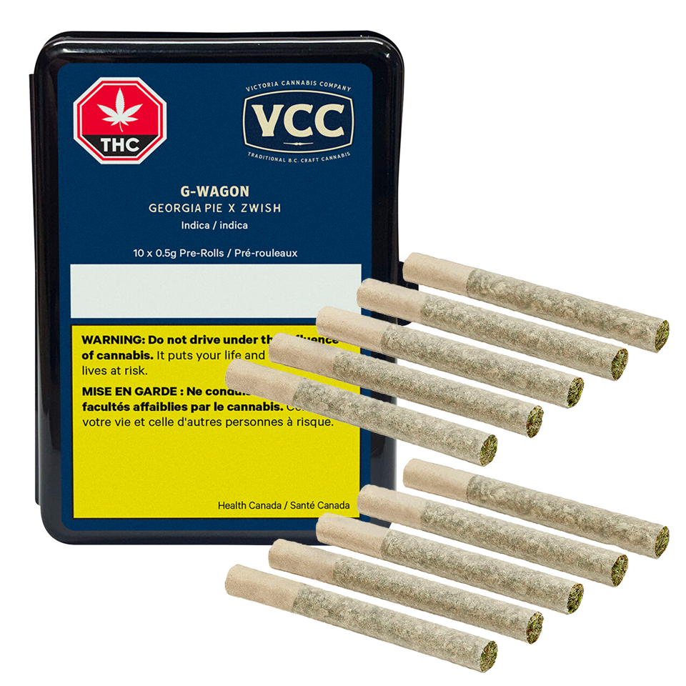 A stunning release by Umami Seeds, G-Wagon is a cross of Georgia Pie x Zwish. This indica-leaning bruiser grows in chunky, box-like clusters of bright silver, resinous flowers. This is VCC’s first release of a very unique flavour profile. This flower is straight up savoury and reminds one of lime corn chips and sweet gas. With over 3% total terpenes and high THC flower, a great option for discerning enthusiasts. This product features straight-cut, rice paper pre-rolls in a water resistant tin.