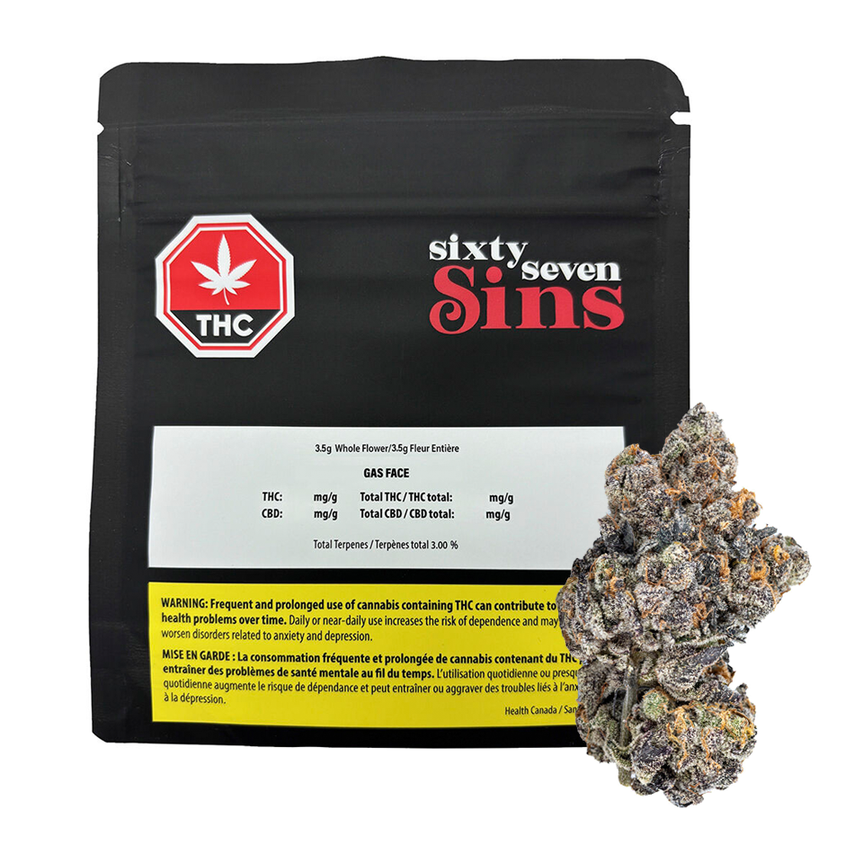 Gas Face is a potent, indica-dominant hybrid strain known for its potent effects and rich, earthy aroma. Bred from a cross of Face Mints x Biscotti, it boasts dense, frosty buds with a blend of dark green and purple hues. The strain has a unique gas-like scent with notes of skunk, fuel, and a touch of sweetness, making it ideal for those seeking a potent strain.