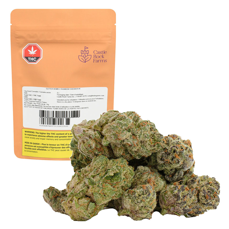 This all out, indica dominant strain crosses Compound Genetics’ 2022 Glitter Bomb with Rainbow Cheddar #5 to deliver buds that are as dramatic in appearance as they are in flavour and aroma. Flavours include gushing grape, sweet peach and kerosene gas undertones topped with a sweet candy kick. Top terpenes include myrcene, caryophyllene and linalool.