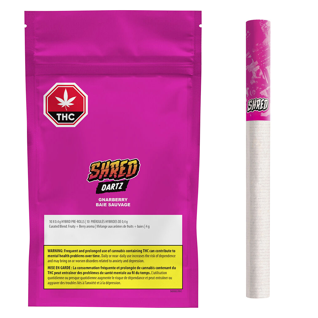 SHRED is back with a new way to enjoy your favourite curated blends. Our Gnarberry Dartz take one of our classic aromatic blends, which is known for dreamy berry and fruity aromas, and stuffs it into straight rolls. These smooth-burning pre-rolls come in a cardboard carrying case to prevent those Dartz from getting smooshed.