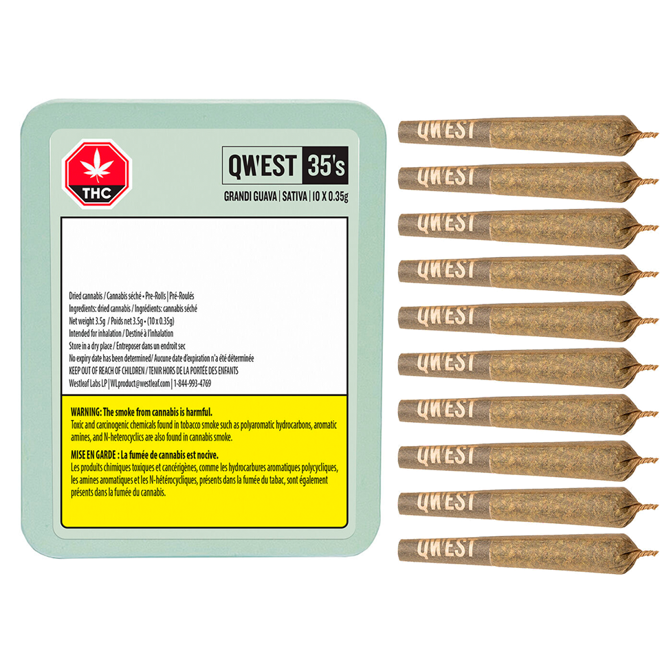 Big on quality. Grandi on flavour. Purple buds covered with orange hairs and trichomes. Grandi Guava is a Guava x Gelato cross, busting with a fruit and cheese aroma and a spicy, tropical taste. Qwest 35’s whole flower pre-rolls are crafted in small batches and hang-dried to keep their natural flavours and potency. Consistent craft quality without the sticker shock. More Dank. Less Bank. The truth is in the bag.