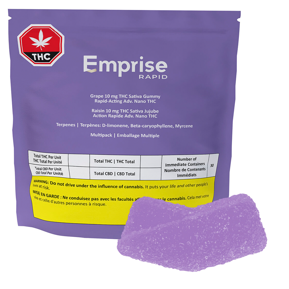 Emprise’s Grape 10 mg THC sativa soft chews have a THC dominant formulation made with Emprise's advanced nano THC emulsions. The product is formulated with full spectrum THC cannabis extract, delicious grape flavour with a sativa terpene profile. Made without animal products. Terpenes include delta-limonene, beta-caryophyllene and myrcene.
