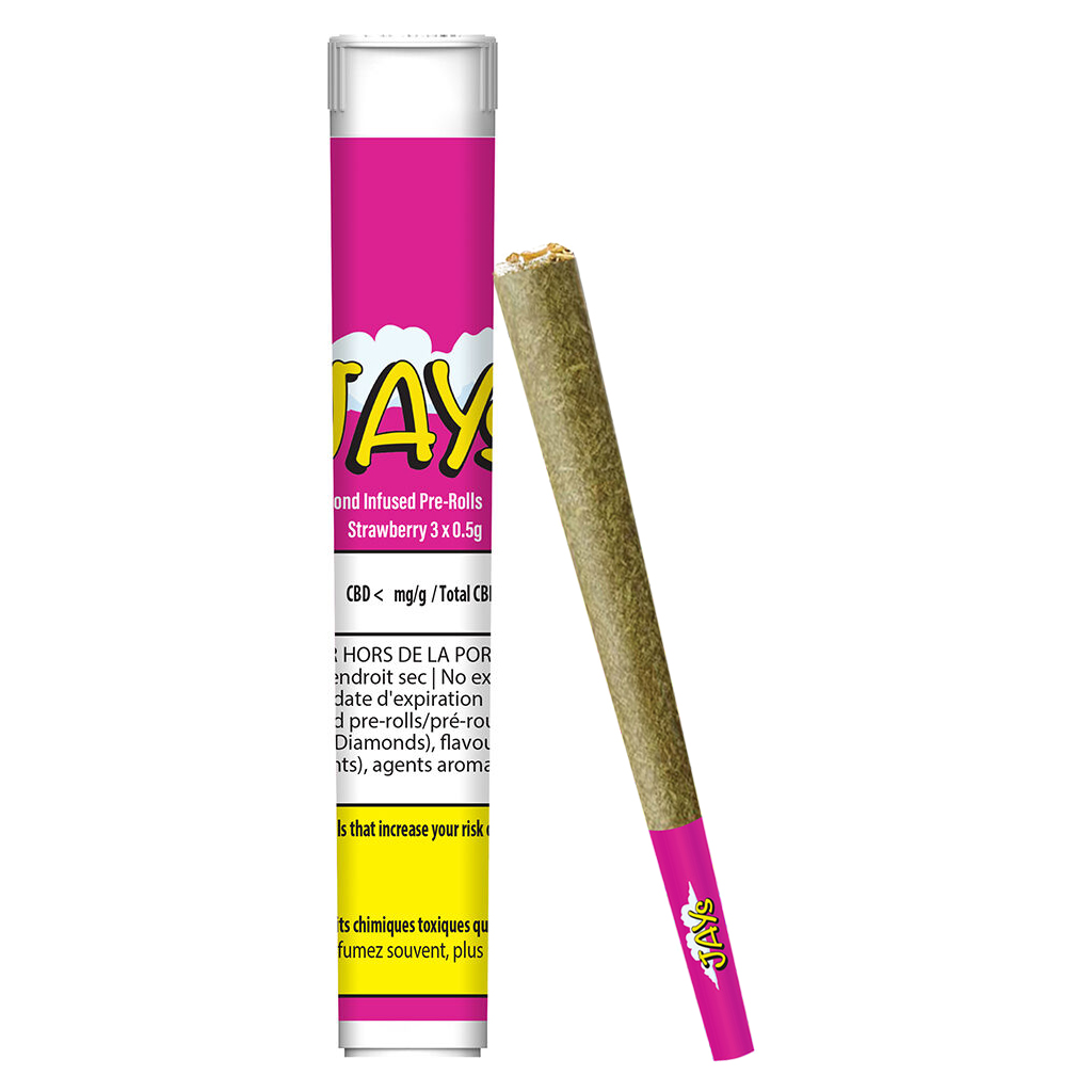 Jays presents potent products full of flavour in convenient formats for everyday Canadians. Each of the infused pre-rolls in this pack are HIGHLY POTENT with more than 50% THC. Our Strawberry pre-rolls bring the sweet flavours of summer strawberries, cream and sugar together for a fruity blast of summer all year long. These infused pre-rolls were carefully curated for those looking for a potent high at affordable prices.