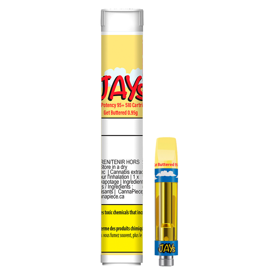Jays presents potent products full of flavour in convenient formats. Get Buttered is a rich and smooth butter-flavoured vape featuring caryophyllene for depth and linalool for brightness. These highly potent 510 cartridges are formulated with quality cannabis extract that's high in THC, captured in state-of-the-art custom designed 510 hardware from 14th Round.