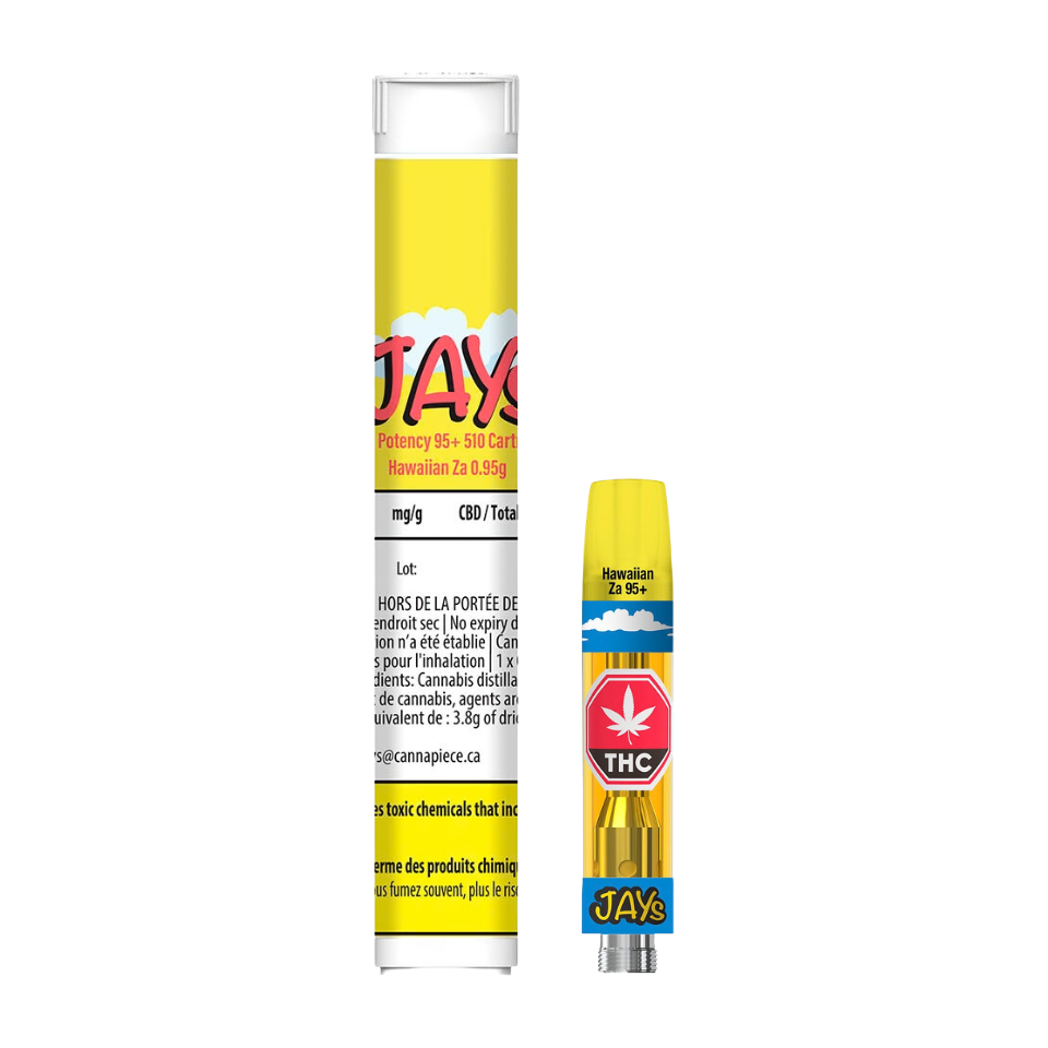 Jays presents potent products full of flavour in convenient formats for everyday Canadians. Hawaiian Za vapes feel fresh squeezed with a sweet and tangy taste of pineapple with some zip. These highly potent 510 cartridges are formulated with quality cannabis extract high in THC, captured in state-of-the-art custom designed 510 hardware from 14th Round.