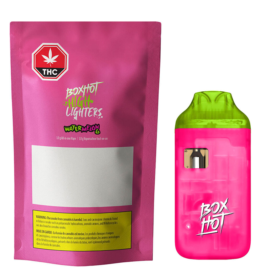 BOXHOT PRESENTS: Watermelon G, a 1.0 g indica all-in-one vape featuring a colossal dose of THC and some of the purest cannabis distillate available on the market. This gushing geyser leaves you flavour-soaked, bursting with intense watermelon and subtle fruity notes. All Highlighters are equipped with rechargeable USB-C technology, so they won't run out of juice before you do.