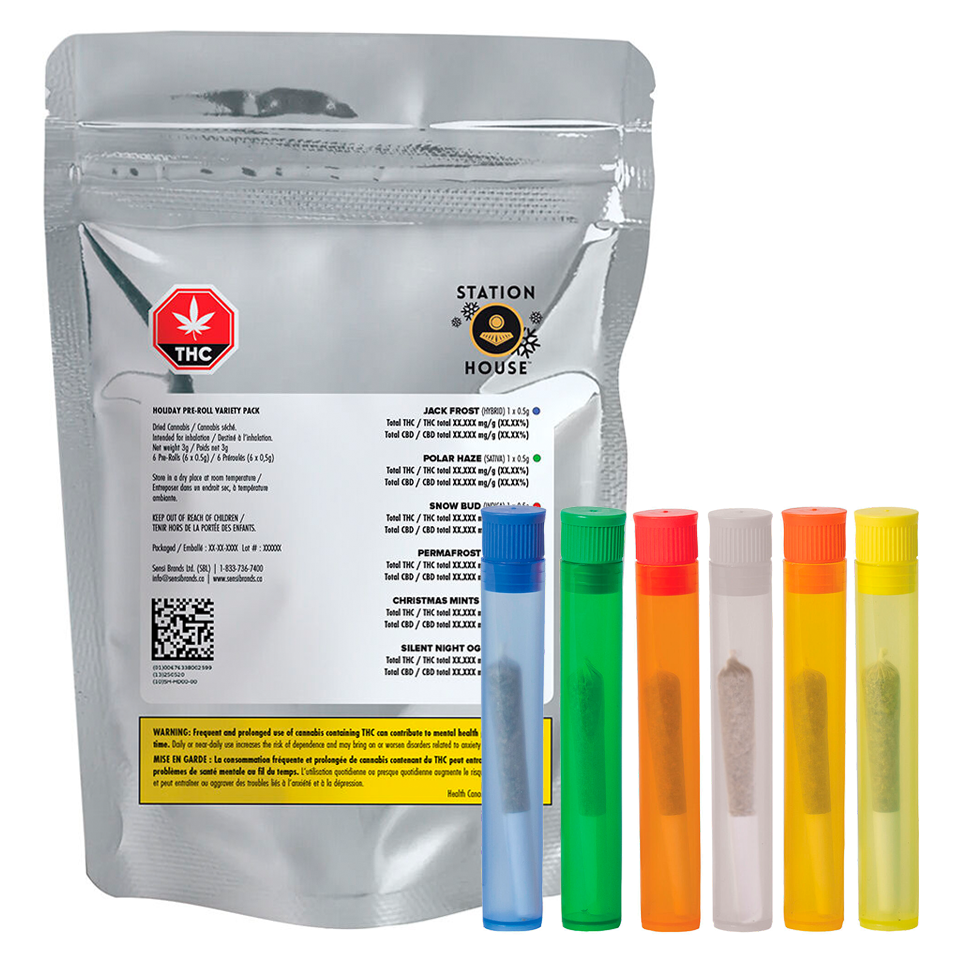 The Station House Holiday Variety Pack is the stocking stuffer of the year, for real! This ultimate strain sampler features six limited edition festive strains in a 6x0.5g pre-roll pack. Enjoy the freshness of Permafrost, the smoothness of Polar Haze, and the minty delight of Christmas Mints. Embrace the crispness of Jack Frost, the sweet, fresh taste of Snow Bud, and the subtle notes of Silent Night OG.