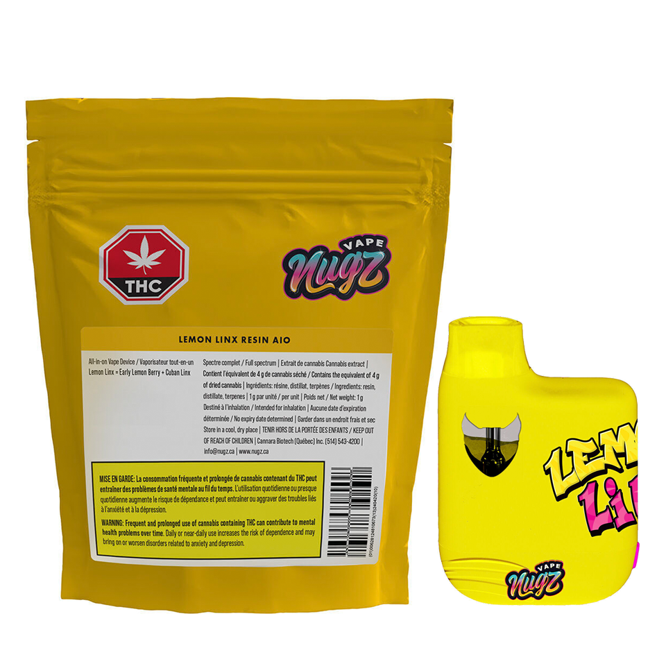 Ever step out for a smoke, only to end up searching for a lighter? Say goodbye to the hassle with the Nugz Lemon Linx Cured Resin All-in-One Vape. Packed with 1g of our finest cured resin, this rechargeable vape is crafted for consistent clouds + a full-flavour experience. Inhale-activated for seamless use, just press the side button 5 times to turn on/off and 2 times for pre-heat! Featuring a ceramic heating element, USB-C recharge-ability, and preloaded to go right out of the box. No extras needed, just pure satisfaction from start to finish. Nugz Lemon Linx Cured Resin All-in-One Vape — everything you need in one device.