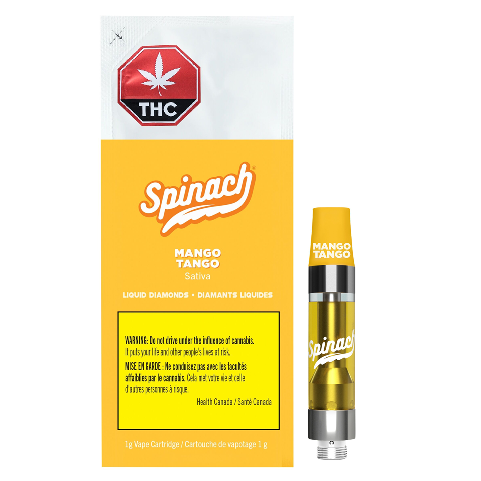 With this vape, it takes two to tango. The Spinach® Mango Tango Liquid Diamonds 1g vape is the flavour you can always count on. Inspired by the Mango Tango strain with a Tangie and True OG lineage, the 98.1% THC potency is no joke, and with liquid diamonds infusion this vape sparkles. While sweet, tropical, and luscious mango flavour notes and aromas fill the air, glide on a juicy cloud through your next vape sesh.