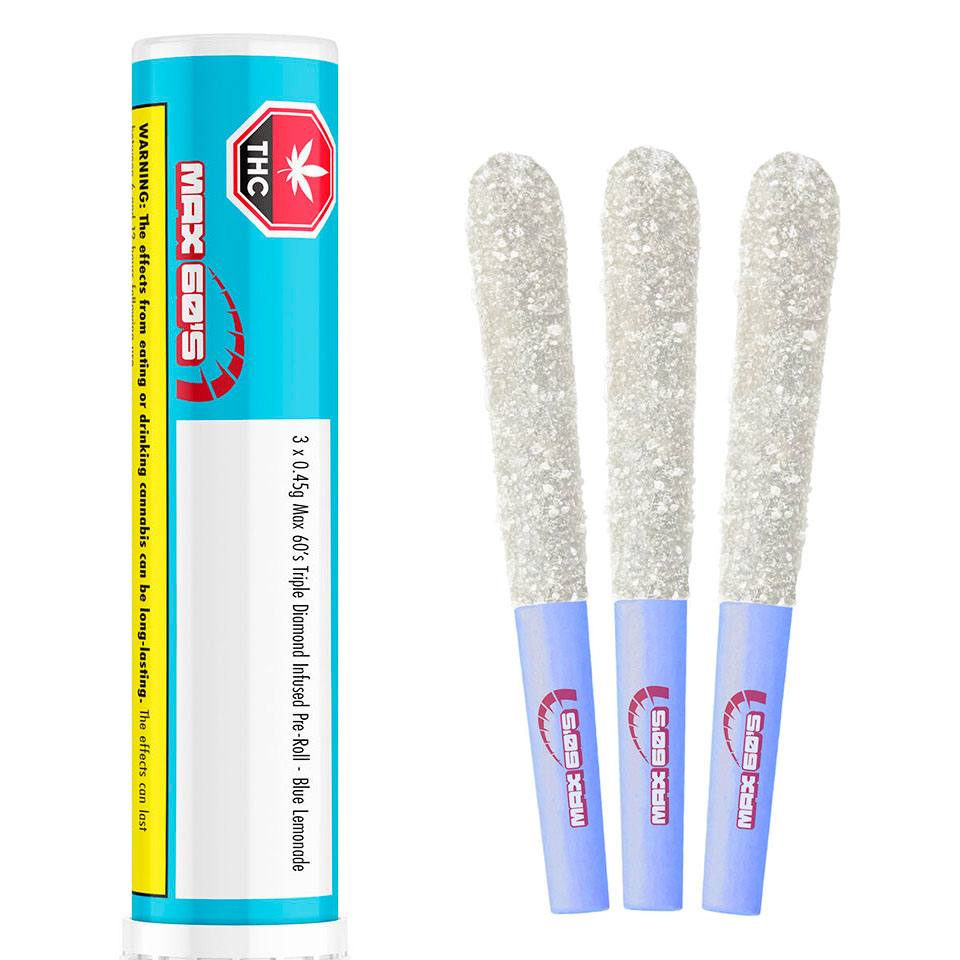 Max 60's triple diamond infused pre-rolls in Blue Lemonade are infused with potent liquid diamonds for smoothness and then coated on the outside with a layer of solid crushed diamonds. These pre-rolls bring the sweet and tangy flavour of blue lemonade with a layered potency.