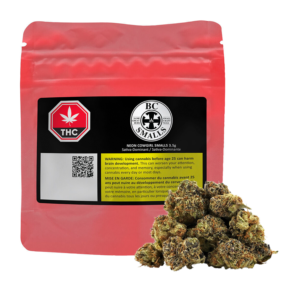 Saddle up. Neon Cowgirl has just ridden into town. Proudly offered under the BC Smalls banner, this sativa dominant beauty is a cross of Strawberry Cough and Peanut Butter Breath. Together, they deliver aromas of dark berries, lemon, vanilla and deep woods.