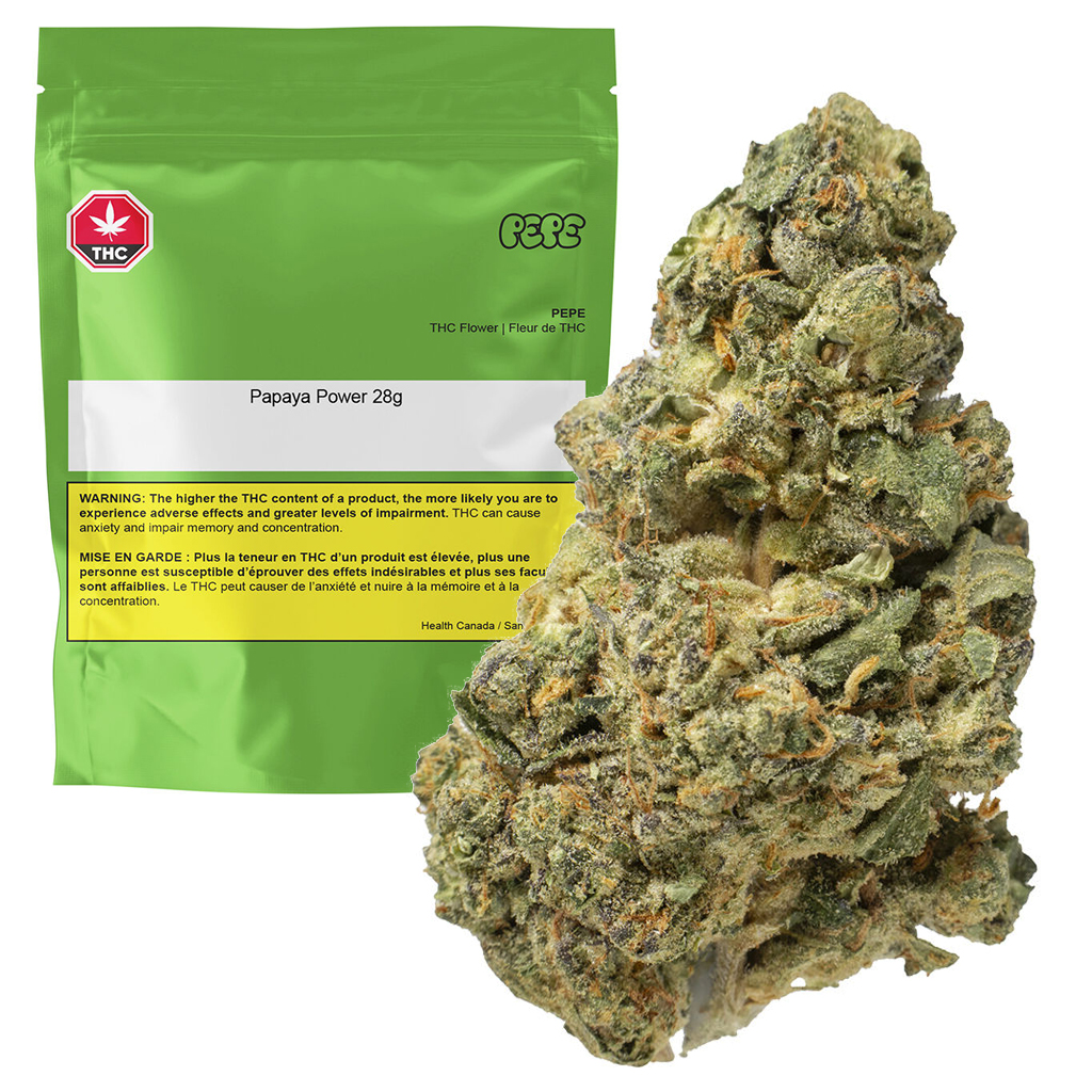 This indica leaning full flower product is filled with only our best buds. Papaya Power boasts a terpene profile dominated by farnesene and alpha bisabolol. Consumers can expect sweet tropical flavours and aromas with big notes of funky gas and hints of parmesan. Bred from Papaya and Power Plant.
