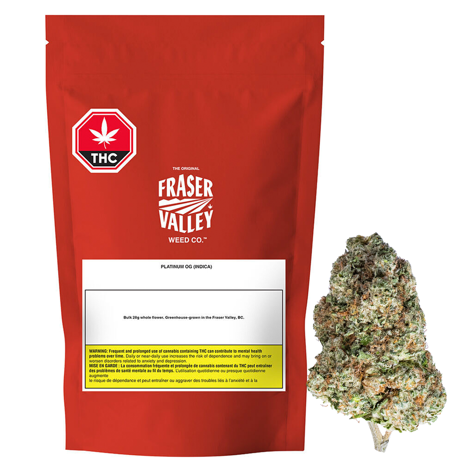 An ounce of Platinum OG. This potent indica is a cross of Master Kush, OG Kush, and a third unknown parent. It delivers aromas of black pepper, sweet earth and pine, layered with notes of herbs and old school gas. Looking at its dense and silvery trichome covered bud, it’s called platinum for a reason. Expertly grown in BC’s Fraser Valley.