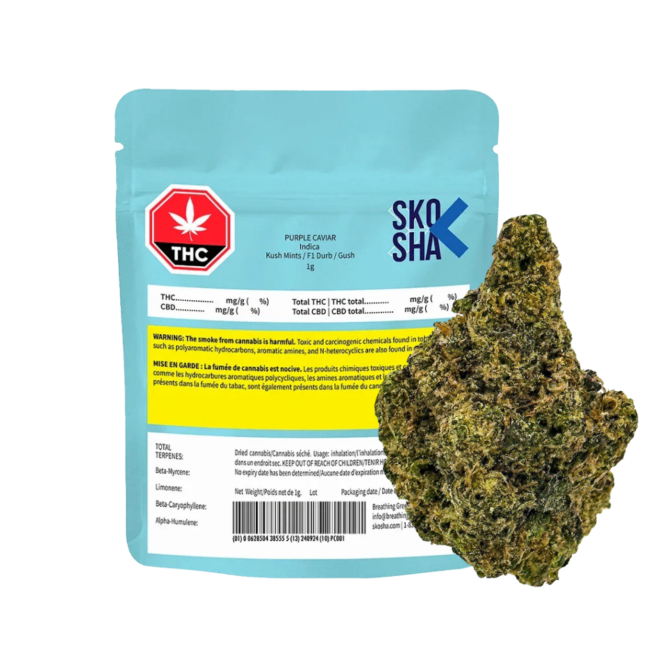 Purple Caviar is another delicacy release from SKOSHA. This indica is a sweet, sour and gassy phenotype. The cross of (Kush Mints X F1 Durb X Gusherz) has resulted in a beautifully coloured flower that will leave you with a pleasant aroma and taste in the aftermath.