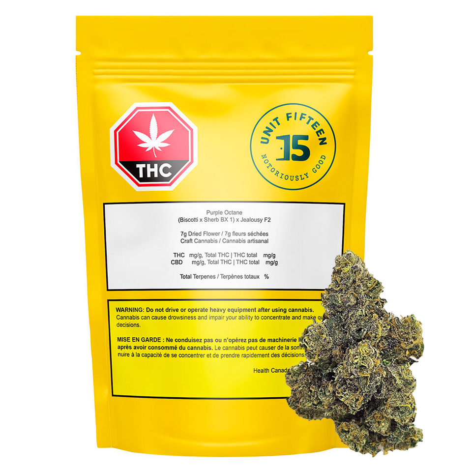 Purple Octane is a strong indica dominant strain that was bred by the legendary Seed Junky Genetics. This indica dominant hybrid has strong roots in the GSC and Gelato families. It is a direct cross between (Biscotti x SherbBX1) x (Jealousy F2), resulting in the appearance of dark green buds with purple hues and glistening trichomes. Its strong gassy aroma fills the room as soon as you open the bag and produces the pungent scent of petrol. It also has fruity undertones of grapes and strawberries. The smoke from Purple Octane begins with a creamy and nutty taste followed by hints of gas and fruit. Grown locally in extremely small batches using state-of-the-art environmentally friendly growing practices, the passionate team at Unit 15 does not let any detail go unnoticed. Every single bud is trimmed by hand and personally sorted and packaged to ensure customer satisfaction.