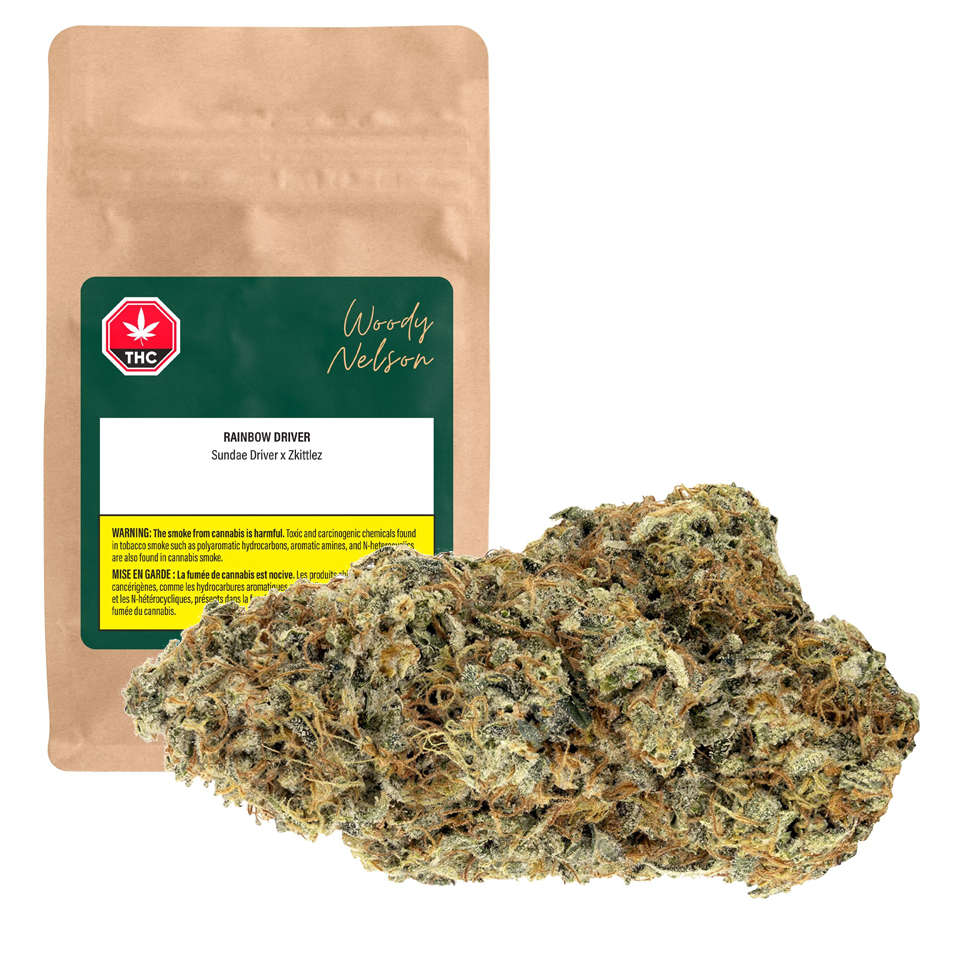 The Woody Nelson edition of the Rainbow Driver genetic was bred by Archive Seed Bank and grown in an indoor vertical farm using living soil. This high THC cultivar is also rich in terpenes, including trans-caryophyllene, farnesene and beta-myrcene, and smells of tropical fruits and gas. The plant's bright sticky buds are hand-trimmed and cured for a minimum of three weeks before packaging. Each glass jar includes whole flower and a Boveda humidity pack.