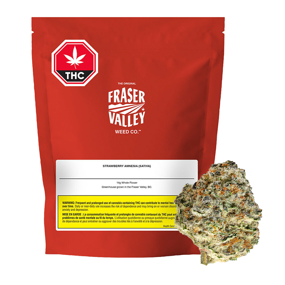 Strawberry Amnesia is smooth and sweet with aromas of wild berries, citrus and earthy cocoa. This potent sativa is a legacy cross of Strawberry Cough x Amnesia, with dense buds featuring pink and purple hues under a thick layer of trichomes. Greenhouse-grown in abundance in BC’s finest growing region, the Fraser Valley.