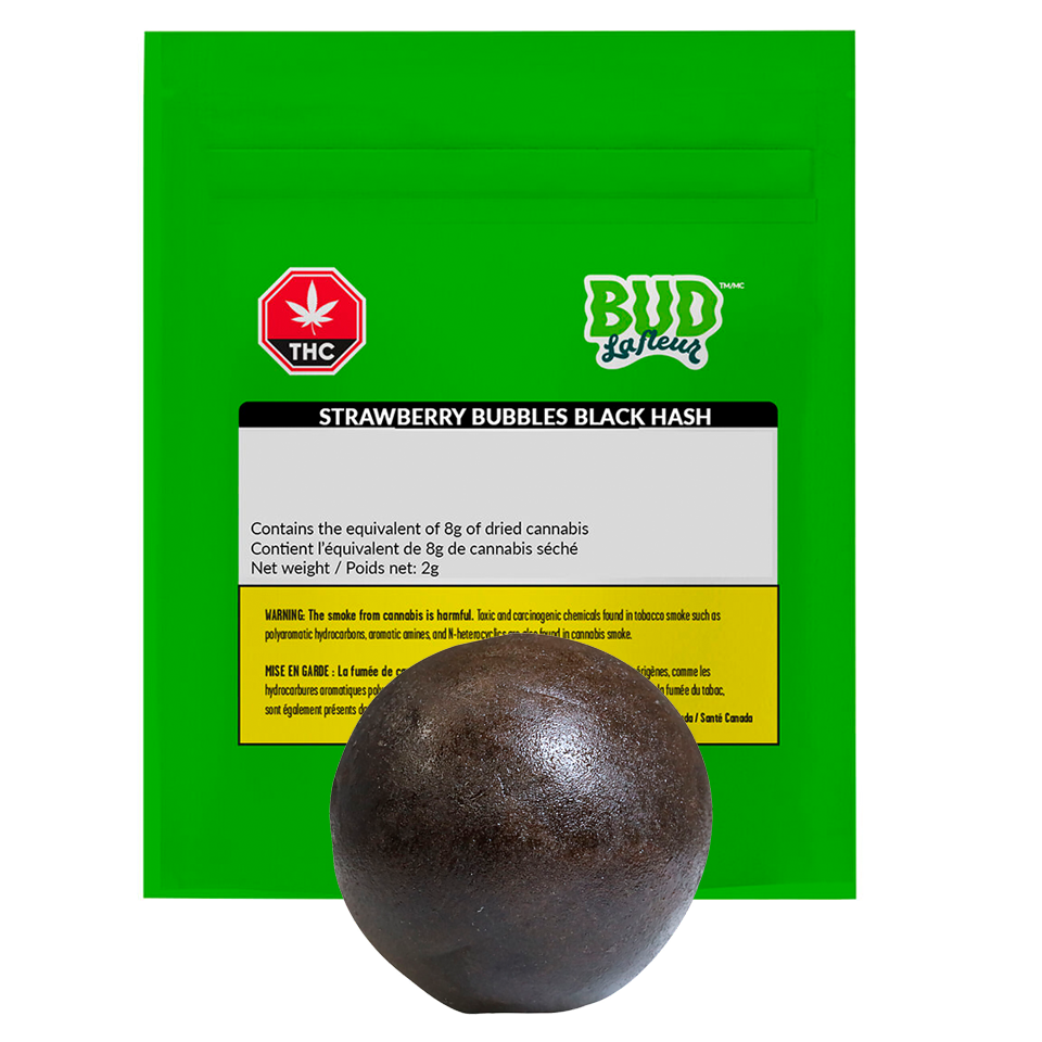 Introducing Strawberry Bubbles Black Hash, a twist on one of our all-time berry favourite sativa strains. This hash is made from our sativa dominant flower, Strawberry Bubbles, meticulously grown indoors, dry sifted, gently sieved, slowly heated and perfectly pressed. Hand portioned and packaged with care, this hash boasts a shiny black exterior and a rich brown interior that's as smooth as it is firm. Its resinous texture is perfect for molding. It has a sweet and fruity aroma.