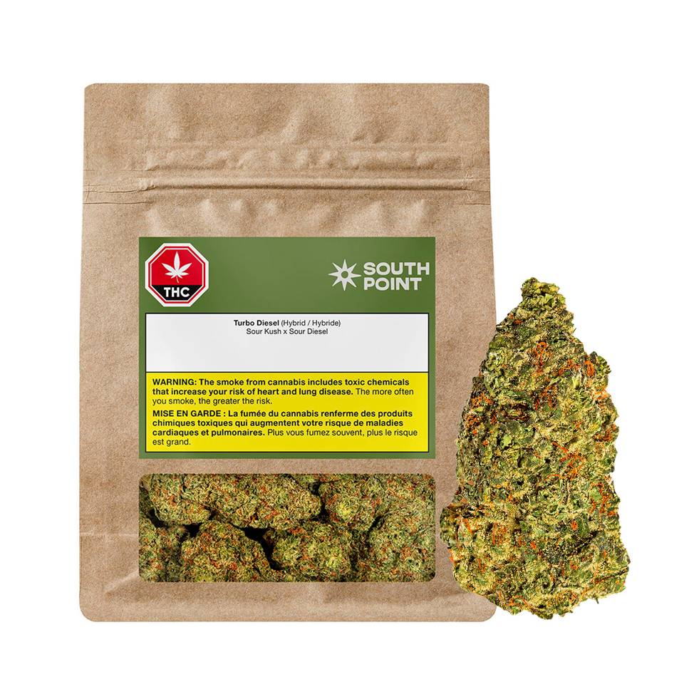 Turbo Diesel is a sativa leaning hybrid born from Sour Diesel and Sour Kush, delivering bold, unmistakable aromas. It hits with pungent petrol up front, rounded out by a hint of citrus and a deep, earthy finish. Grown on Canada’s 42nd parallel, South Point is for those who appreciate the details. We take the long way. Our flower is hang dried, slow cured and hand packed. No gimmicks. No shortcuts. Just great cannabis, straight to the point.
