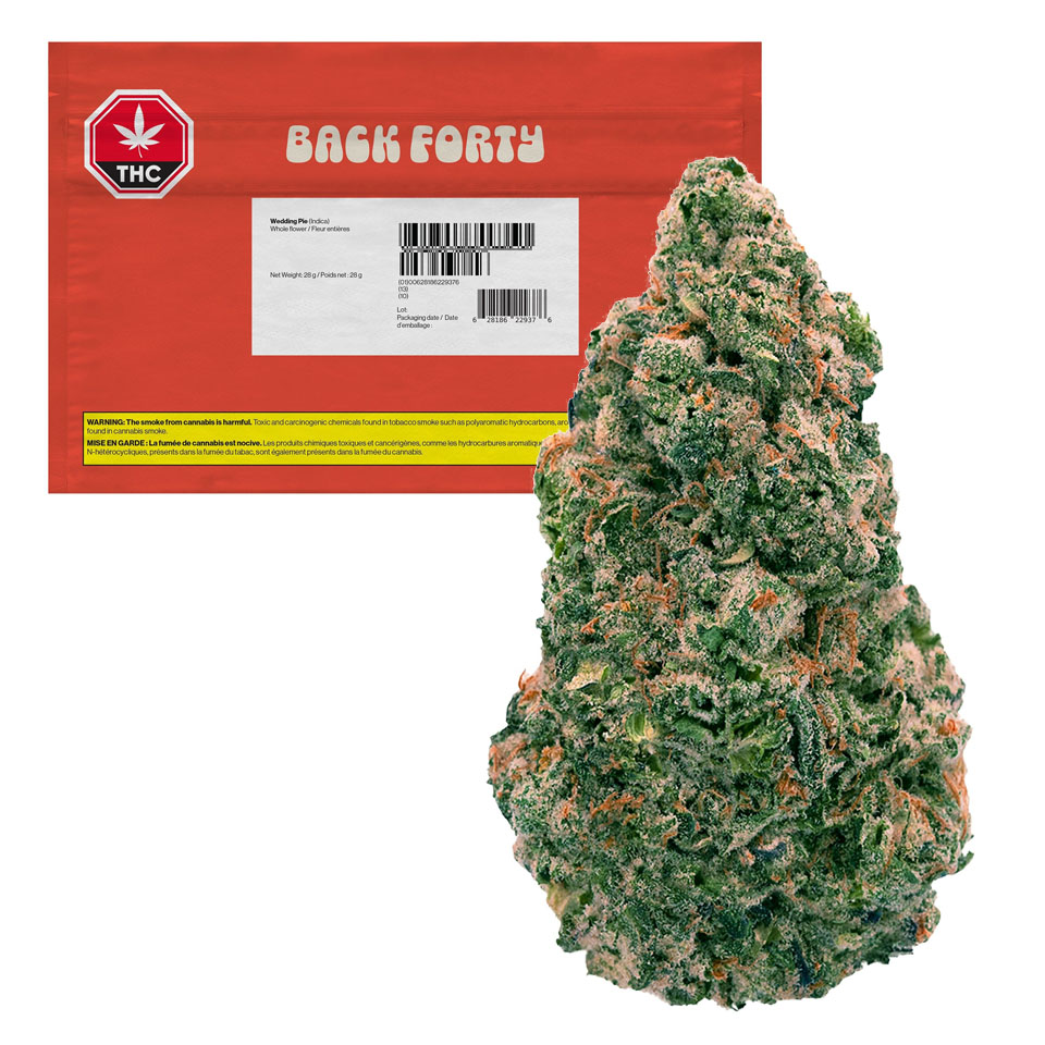 Wedding Pie is a potent Indica that marries Wedding Cake x Grape Pie into one legendary cultivar. With dense green buds and layered aromas of pastry, berry, and grape, it’s baked with love and built for exploring. Like all Back Forty flower, it’s hang-dried, dry-trimmed, and sealed with a humidity pack.