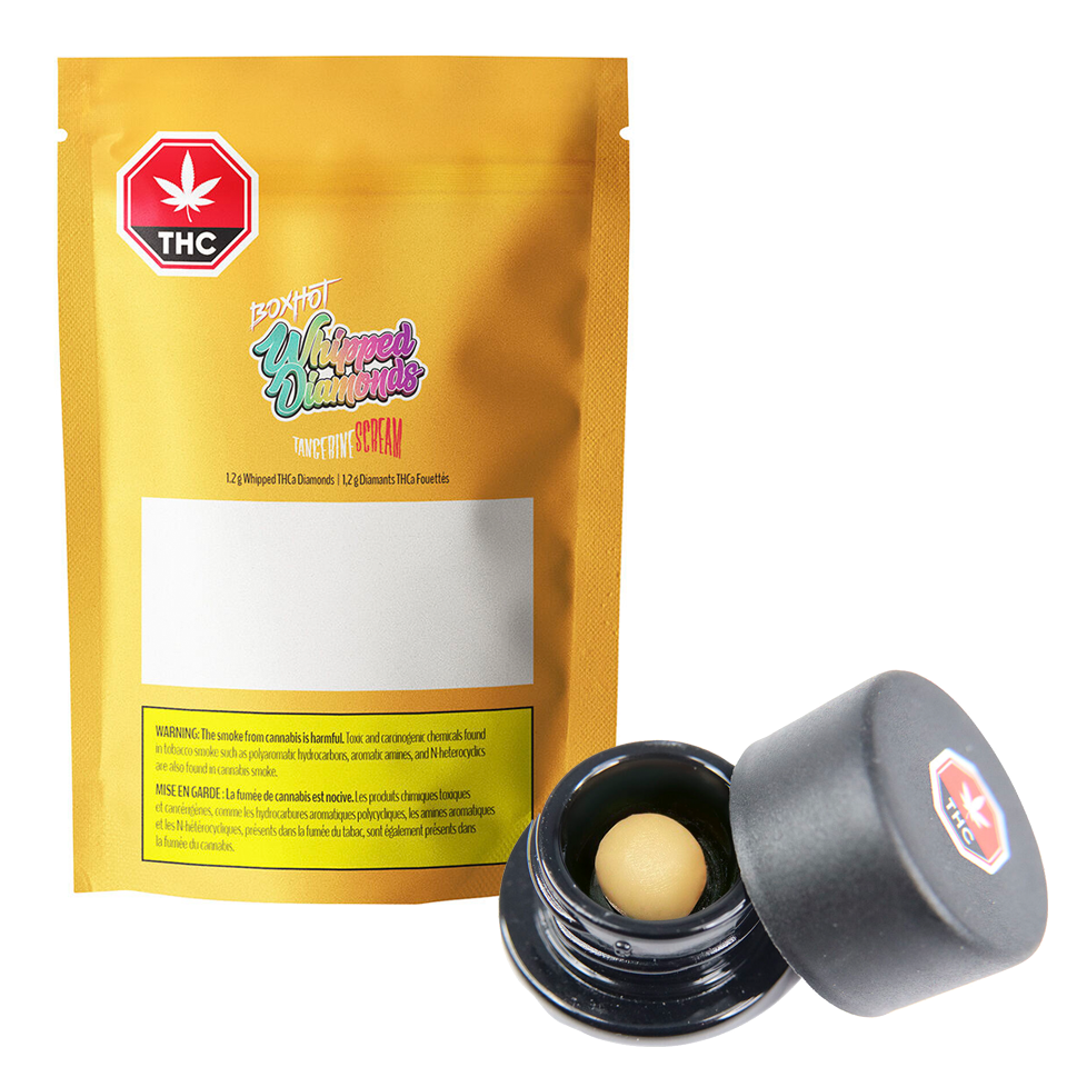 Blast to the future with BOXHOT Tangerine Scream Whipped Diamonds, a blazing behemoth that comes alive with good citrus vibrations and a touch of berries and tropical fruits. Super pure sativa THCa diamonds are converted to a butter-smooth consistency and boosted with botanical terps to deliver a one-two hit of flavour and potency. Add this next-gen highly potent concentrate to a dab rig and crystal whip them taste buds.