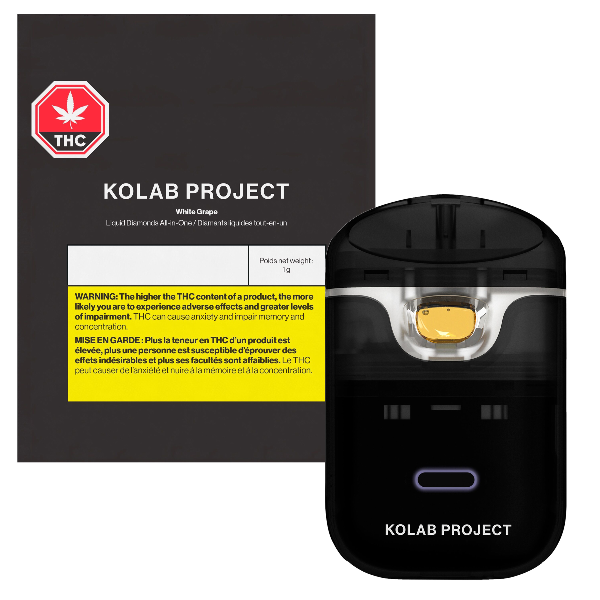 Kolab Project's proprietary AIO vape combines state-of-the-art technology with novel and convenient design. Kolab's device is rechargeable, uses a blue ceramic coil, and offers dual-heat settings to guarantee a carefully crafted experience. White Grape Diamonds AIO uses a hydrocarbon-extracted liquid diamonds base to achieve a THC potency of 92-98%, with a light grape and floral finish on the exhale. Embrace the unexpected with Kolab Project.